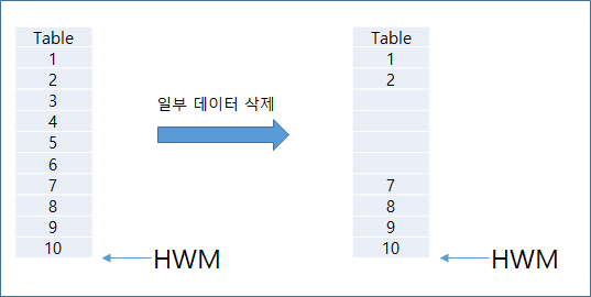| - 신규 데이터 Insert 불가 - Full Table scan시에 HWM까지 탐색하므로, 불필요한 작업 발생 |