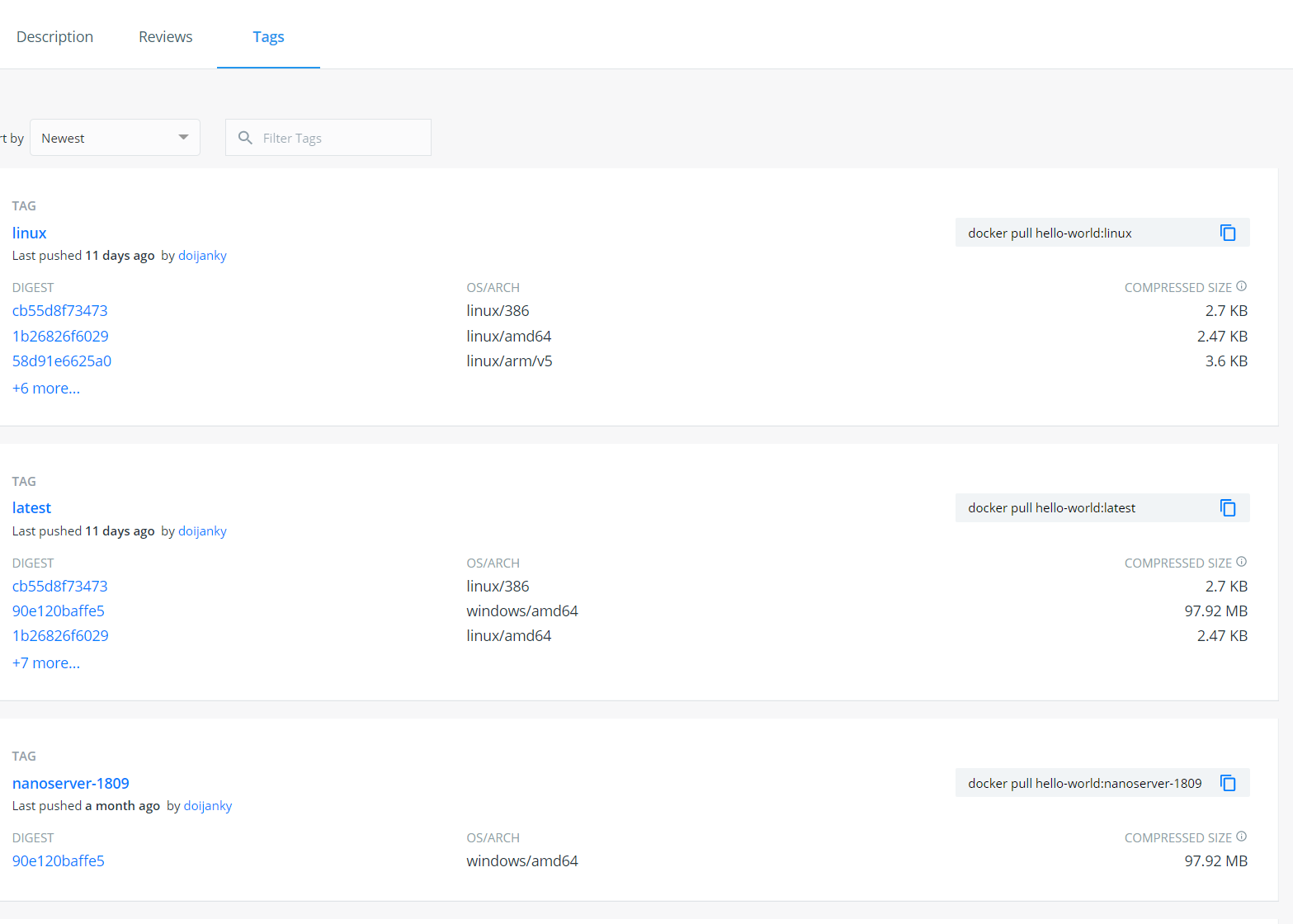 그중에서 도커 공식이미지인 Hello-world 이미지를 살펴보자