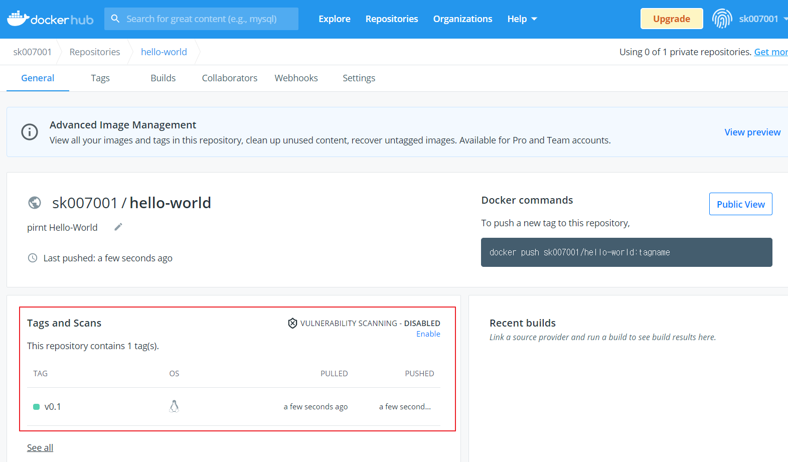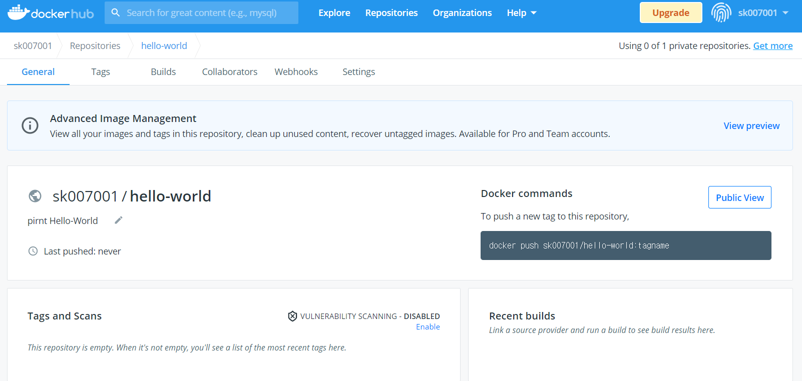 앞의 sk007001은 개인 hub 저장소 위치를 명시해주었다.